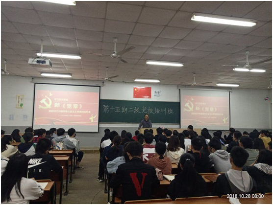第一部分是集中授课。首先由学生党总支书记林海春老师带领同学们学习了《十九大党章》,他从中国共产党章程的历史沿革的一系列变革做了详细的讲解介绍,重点阐述了党章的重要地位和作用、党章建设的历程、十九大党章的重大创新发展以及我们怎么样才能做到认真学习党章、严格遵守党章、切实贯彻党章、坚决维护党章。
