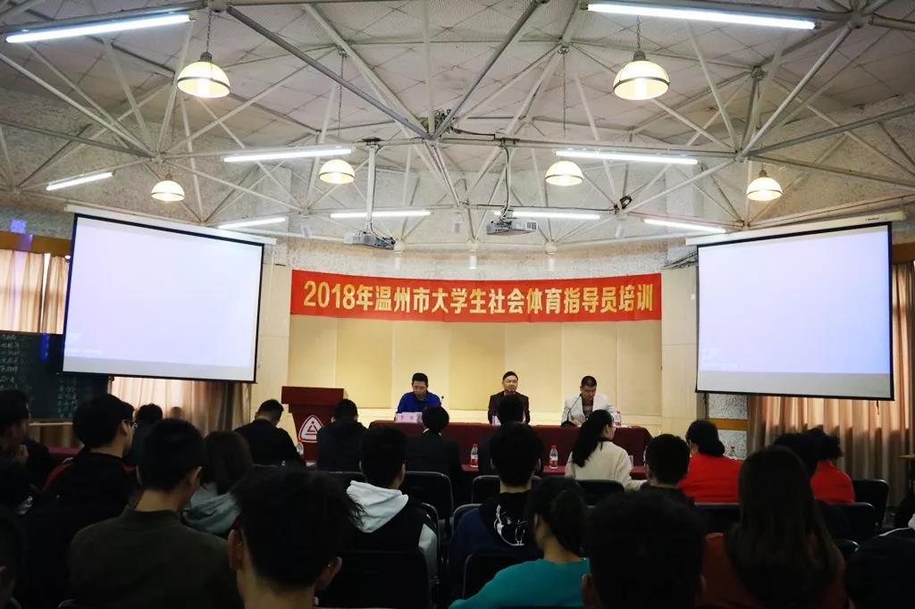 11月19至20日,2018年温州市大学生社会体育指导员培训班在我院举行。共有87名大学生参加了培训。培训班开课前举行了开班仪式,温州市体育局群体处处长温从达、浙江工贸职业技术学院网球学院副书记朱景多、浙江工贸职业技术学院网球学院体管专业主任朱秀清、体育教研室主任白福川、指导老师邹文平、辅导员谢戴海等出席了开班仪式,温州市社会体育指导中心社体科副科长李勇主持开班仪式。