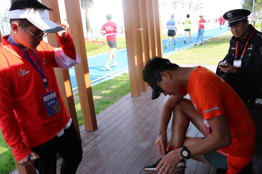 随着发令枪的一声枪响,本届马拉松比赛正式开始,各个参加不同竞赛项目的人群如潮水一般涌出,一万两千多名运动员迈着他们矫健的步伐奋力的奔向终点,每跑过一个补给站,我们的志愿者们都要为前来需要帮助的运动员们“排忧解难”,及时帮助运动员们肌肉拉伤放松,同时为拉伤的运动员们消炎止痛,而对我们而言最好的礼物是伤员们的感谢,运动员们脸上洋溢着充满斗志的笑容,更让我们铭记“红马甲”的职责,精神抖擞地面对每一次挑战。而对于那些因为受伤不能再继续跑的运动员,我们也会给予他们足够的关怀与安慰,鼓励他们明年再来,让他们不留遗憾的离开赛场。