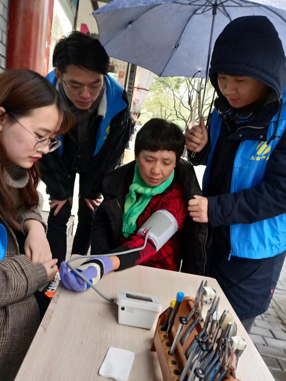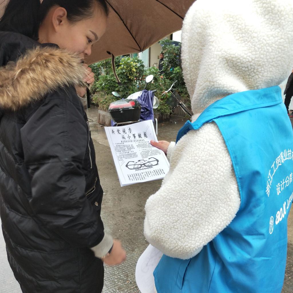寒风凛冽,伴随冬天冰刺搬的雨滴,在黄龙小区的几条主要街道上,都闪烁着身穿蓝马甲志愿服的身影。有的是负责发关于爱护眼睛的技巧和一些细节的作法的纸质资料,有的是发送关于生活中用眼情况的调查问卷表。志愿者们各司其职,在寒风中兢兢业业向行人介绍爱眼护眼知识,接受资料的行人们,有孩子,有为人父母,有年过花甲的老人无一不认真聆听着志愿者的讲解,阅读着资料上的护眼知识。还有一批眼视光专业的志愿者驻留在摊位前,摊位摆上了清洗眼镜以及修理眼镜的工具。这些志愿者们充分运用本专业,免费为行人清洗眼镜,修理眼镜,有许多佩戴眼镜的行人们驻足提出需要,志愿者们也热情的帮助他们。在摊位旁的血压测量计也受到青睐,在测试出血压有问题时,志愿者们对测量者提出建议,让其注重身体健康。