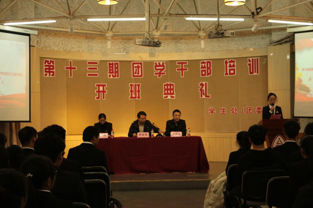 12月12日18:30,由学生处(团委)主办的“学习新思想建功新时代”青马工程学院第十三期团学干部培训班正式开班。参加本次活动的有学生处处长林海春老师,马克思学院院长尹清杰老师,团委张慧老师,各个分院的主席团以及各个组织主席团和部长。在场的学生干部统一穿着正装并佩戴了团徽校徽,每个细节无一不体现出干部们对培训的重视。