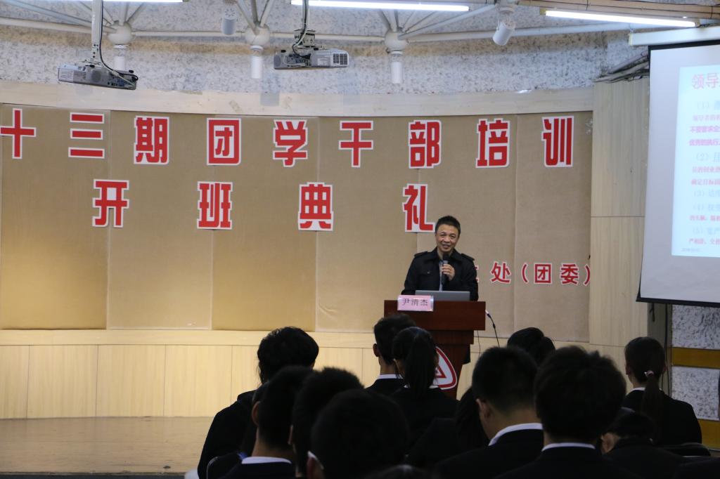 本次活动总共分为六个议程:奏唱国歌、奏唱共青团团歌、团委张慧老师介绍课程安排及相关要求、第十三期学员代表表态、学生处林海春老师宣布开班、尹清杰老师开班培训第一讲。