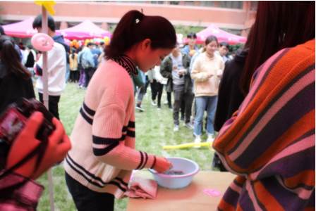 在初赛环节,由2017级各班各自设置游园活动项目供全体2018级学生参加活动,同时各班现场表演一个节目。根据班级游园项目2018级学生的参与度、游园活动组织的流畅性以及节目表演的质量等评出参加班级团日风采大赛决赛的班级名单。当天下午,随着开场舞的亮相,初赛拉开序幕,2017级各班级根据活动流程纷纷使出所有招数,介绍推介本班级的游园项目,以吸引2018级学生的参与。随即,乒乓球水上漂、夹弹珠、踩气球、套圈、脑筋急转弯、你画我猜等游园活动此起彼伏,2018级学生饱享15个精心准备的游园项目,每个游园活动摊位前都排着长长的队伍,参与者的脸上都洋溢着快乐的笑容,玩得意犹未尽。同时舞台上2017级各班精心准备的节目精彩纷呈,令现场观众目不暇接,气氛热烈。