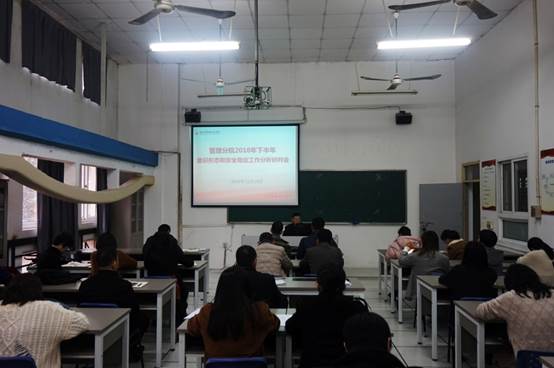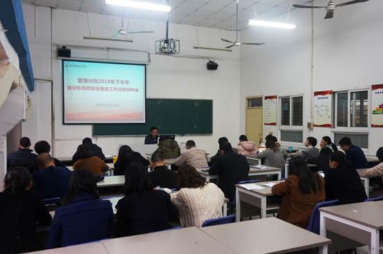 为贯彻落实上级和学院党委关于意识形态工作和校园安全稳定工作的决策部署,落实意识形态工作责任制、校园安全稳定工作责任制,为学院第三代党代会的胜利召开提供和谐稳定的环境,管理分院于2018年12月19日下午在5209教室召开2018年下半年意识形态和安全稳定工作分析研判会。管理分院全体教职工、全体班主任参加,会议由管理分院党总支书记项光春主持。