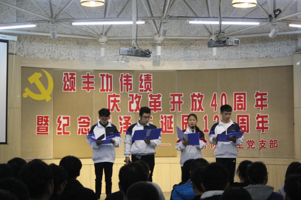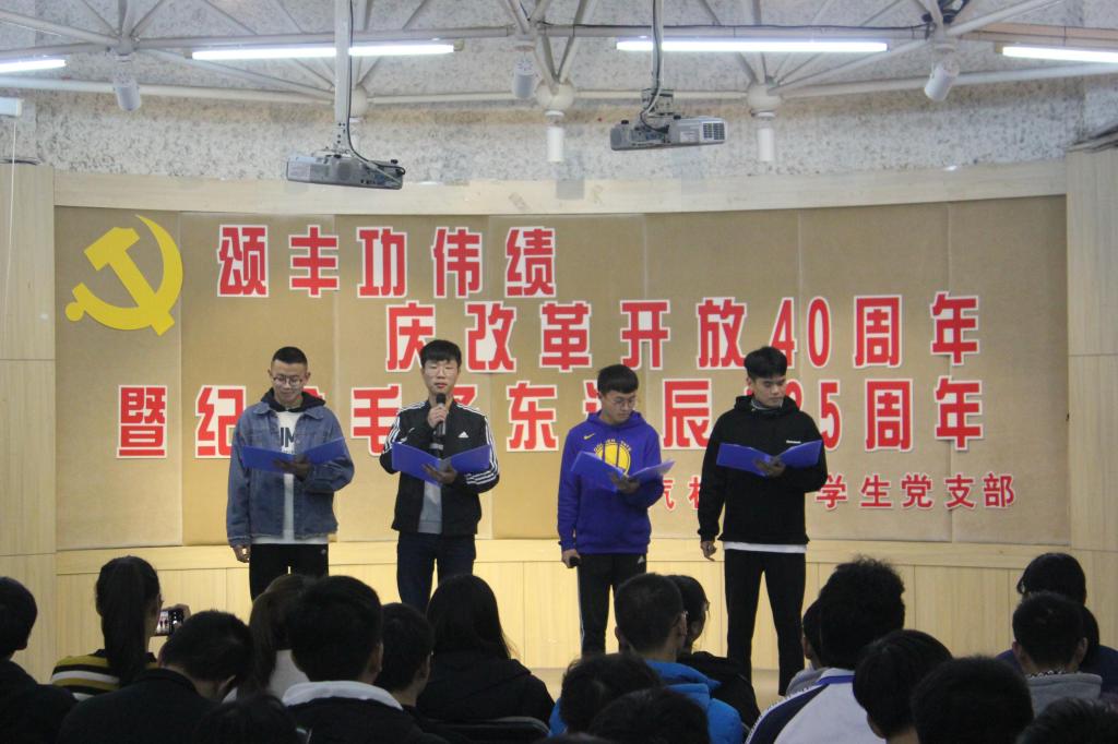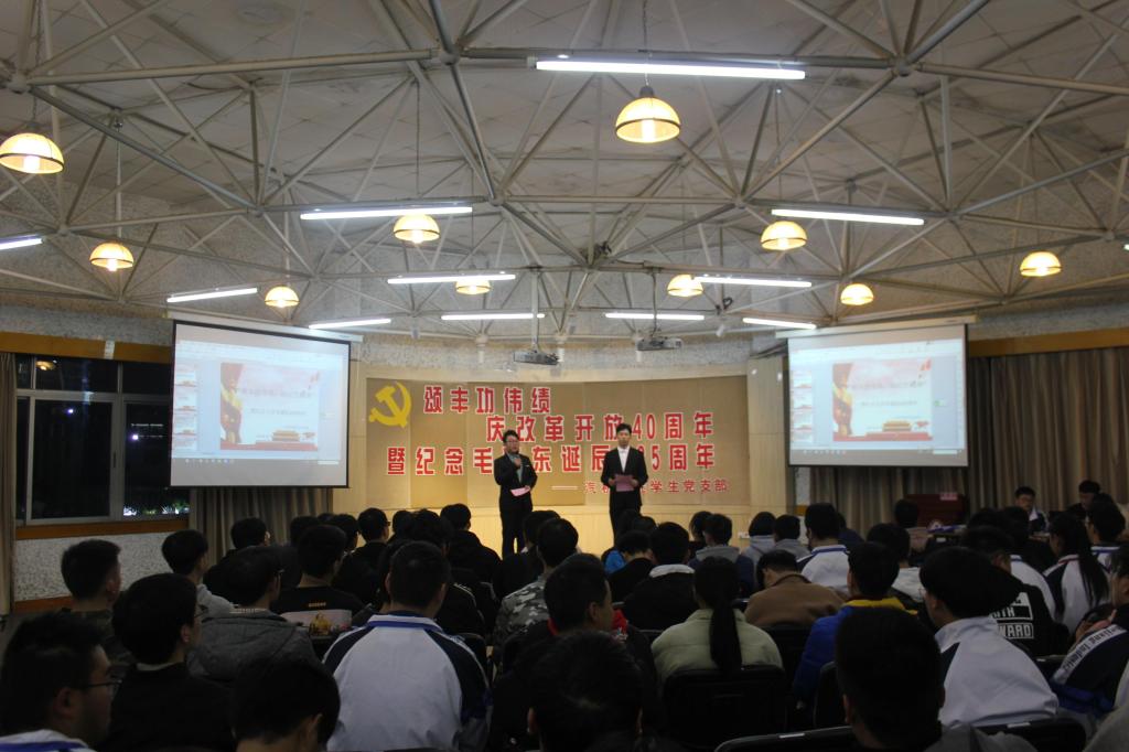 2018年12月26日是伟大领袖毛泽东诞辰125周年,为了纪念毛主席诞辰并庆贺改革开放40周年,12月25日晚上,汽机分院学生党支部在多功能厅举办“颂丰功伟绩·庆改革开放40周年”暨纪念毛泽东诞辰125周年活动,分院第二学生党支部书记黄丹华老师、学生党员、入党积极分子参加了此次活动,活动由学生党员沈傢豪和分院团副唐成杰主持。