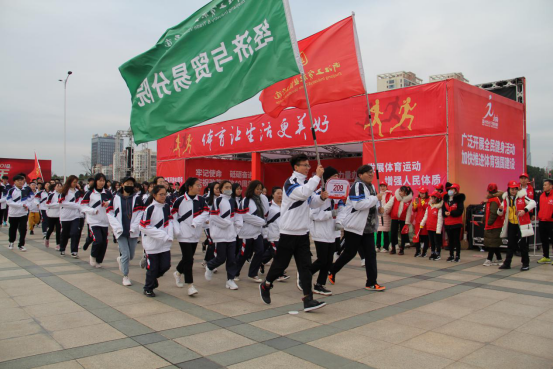 随后,在发令枪鸣响之后,穿着统一校服的工贸学子,挥舞着旗帜,用最饱满的热情喊着“经贸经贸,工贸骄傲,永争第一,唯我经贸”的分院口号。在跑步过程中,经贸学子始终以整齐矫健的步伐前进,从世纪广场南广场出发,途径市府路、惠民路、锦绣路、府东路、市府路,最后抵达世纪广场北广场,全程约4000米,全程队员们满怀激情地展现了年轻大学生积极向上的精神面貌。