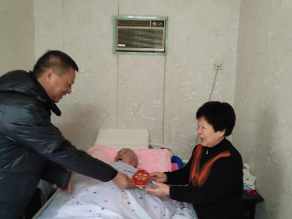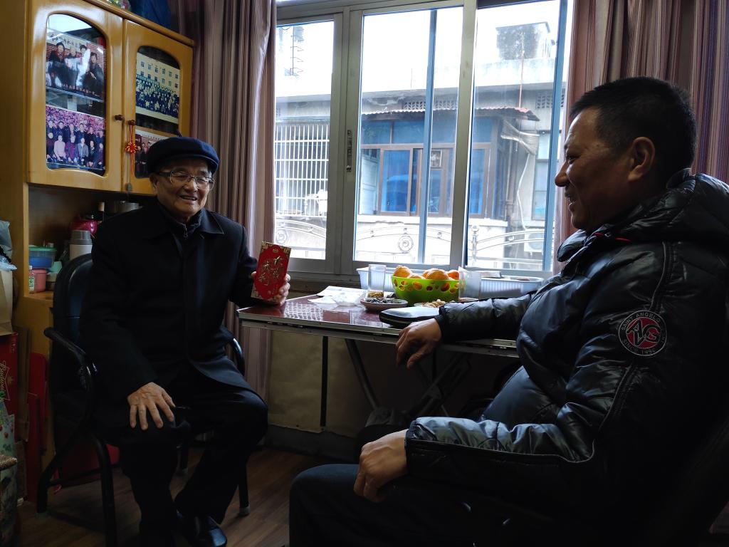 寒风伴小雨,温暖在行动,一行人来到了敬老院,看望90岁高龄的老员工叶慧卿,为他送上节日的慰问和祝福。当他接过饱含情义的慰问金时,很真诚地说道:谢谢你们!非常感谢集团不忘他们,时刻牵挂着他们退休生活。一番亲切问候交谈,祝福老人新年快乐,健康长寿。随后,一行人员到高龄劳模李国栋家中慰问,了解他的生活情况和身体状况,感谢他们为社会主义建设做出贡献,祝福他们身体健康、幸福快乐。老模范不时地露出幸福的微笑。