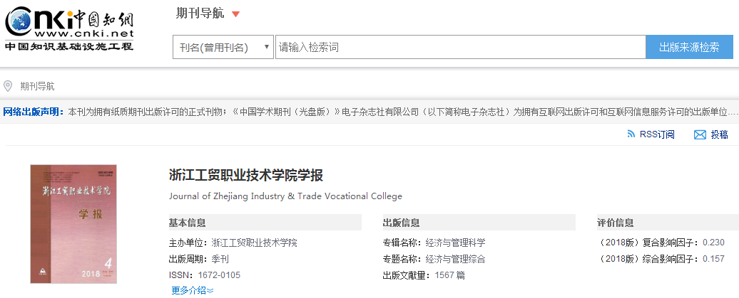 《浙江工贸职业技术学院学报》从2002年获准创刊至今已整整17年。在学院领导及全院师生的关爱及各届学报编委的努力下,学报始终以服务高职教育教学改革及内涵发展、服务教师专业化和学术化水平提高、服务产学研一体化为宗旨,坚持正确的办刊导向,严把质量关,努力提高办刊的水平和质量,逐步形成了学报的学术风格和栏目品牌。据权威评审机构发布,我院学报2018年的复合影响因子为0.230,创本刊历史的新高,跻身浙江省高职第三名。