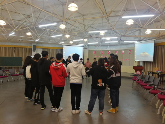 活动分为四个阶段,第一阶段是热身。戴老师通过“逃离痛苦追求幸福”、“猜拳接龙”等游戏一下子活跃了氛围,调动了学生的积极性,拉近了同学间的距离。第二阶段是分小组游戏。用“生日圈”这个小游戏自我介绍,艺术表达自己,敞露自己。进而让同学自我认知:手的比较。此游戏让人明白每个人各有所长,各有所短,要善于发现自己的优势,挖掘自己的优点,扬己所长,肯定自己,相信自己,接纳自己。第三阶段是通过动物卡片进行自我探索,触摸自己,进一步了解自己,发现独特的自己,拥抱自己。最后阶段是集体创作love、Hope、Faith。每个小组成员进行绘画、拼图,团结合作,凝心聚力,共同完成。每个人心中有坚定的信仰,在充满爱的世界里,沐浴阳光,奉献爱心,憧憬着无限美好的未来。二个小时的活动在欢声笑语中很快就结束了。