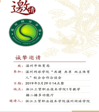2019年3月29日下午,春意盎然,春和景明,沐浴着《全国职业教育改革实施方案》颁布的春风,在学院第三次党代会精神的指引下,温州网球学院在学院多功能厅隆重举办了“共建共享、校企双主体育人”校企合作洽谈会。