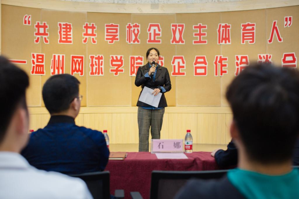 随后,朱秀清老师介绍了温州网球学院体育运营管理专业基本情况,她说:我院体管专业是在国家大背景下:应势而谋、应势而动、顺势而为创办的一个新专业。因为新,所以会更加热切期盼来自政府、学校、和社会的关心和帮助。专业自2016年招生两年半来,正在逐渐探索“技商两元型”人才培养模式。在体育产业蓬勃发展的新时代背景下,专业办学以服务温州区域体育产业发展为方向,为温州培养面向体育行业,如健身场所、体育培训市场、体育装备市场的营销服务人员、商务专业人员等,同时培养能从事体育赛事组织和实施、体育场所管理和服务等工作的高素质技术技能复合型体育人才。为了能够早日培养不被市场淘汰、满足社会需求、符合企业要求的毕业生,专业在校企合作中正逐步探索“五融合六对接”模式。