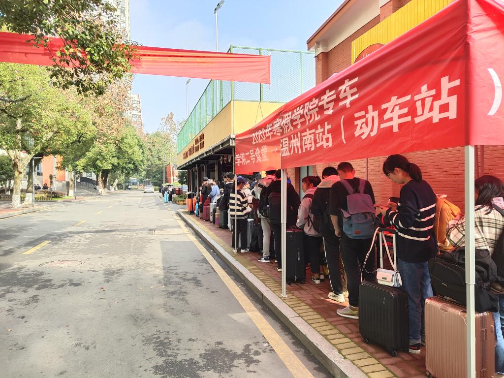 寒假将至,正值大学生离校高峰期,学院为方便同学们寒假回家,保障同学旅途安全,在校车资源紧张的情况下,如期开展了冬日暖心校车送站服务活动。专车于2020年1月6日和7日的固定时段在学院二号食堂门口送离校的同学们至温州南站,所有车辆均是流水发车,坐满即走,更有大学生志愿者热心地帮助同学们搬运行李,直至班车安全到达目的地。