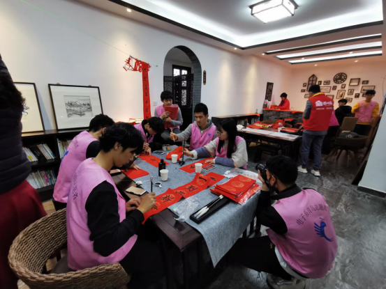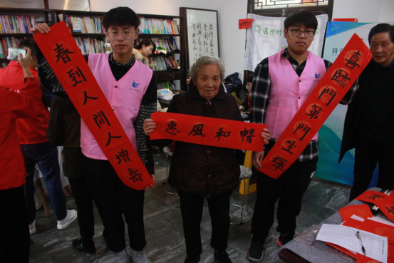 青鸟志愿队准备的写对联,写福字等活动,也让志愿者们对中国的传统文化产生了浓厚的兴趣,就这样,一幅幅小作品从志愿者们的手中诞生了。随着活动的进行,越来越多的老人参与了进来,和志愿者们一起感受着中国传统文化带来的乐趣。老人们对志愿者们写的对联给予了非常高的评价,一幅幅满怀祝愿的对联带来了承载着自己对新来的一年美好的期待和祝愿;志愿者们用灵巧的双手将一张张五彩斑斓的卡纸,变成一幅幅精美的窗花,让人爱不释手。通过这开展的一系列活动,让志愿者们感受到了志愿的真谛。最后,志愿者们用在社区礼堂与老人们的合影结束了本次的志愿活动。