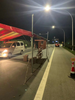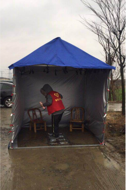 沈媛与家人的工作主要是负责查看路口过往车辆与行人,管理乡道。上午沈媛的父母值班,下午沈媛与姐姐值班。下雨时就在临时搭建的小棚子中工作,从照片中可以看到,棚子其实非常小,仅够放下两把小椅子,也不能够抵御冬雨中的寒气。但沈媛说,因为疫情严重,所以需要更多的志愿者来看守村子众多的路口,环境差并不算什么,总要有人去的,她和姐姐都是党员,而自己更是一名退役军人,这是她的责任和义务。沈媛负责的村子防疫工作安排的比较早,在长期的值班中,沈媛已经没有了时间概念。