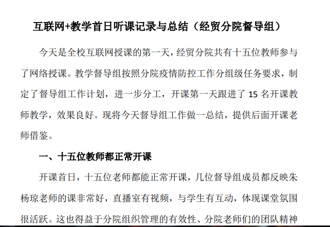 分院第一周教学的顺利开展,得力于分院推出了三项举措,推动了“互联网+教学”的顺利开展。一是及时召开视频工作会议,召开党总支委员、互联网+防控小组、全体教师、教师党员、思政工作等层面会议,深入贯彻教育部、省教育厅和学校“停课不停学”相关精神,扎实落实学校布置的工作任务,确定将上级精神传达到每个专业、每位教师。二是积极做好教师服务工作,分院互联网+防控设备组主动联系各位教师,帮助部分老师克服在家网络带宽限制、电脑、摄像头、麦克风设备欠缺等各类困难,同时要求党员教师做好先锋模范作用,主动承担因教学资源不足导致在线教学难度较大的课程教学任务。三是做好教学跟踪工作,由分院督导和行政工作教师排班担任教学督查和服务工作,及时向分院反馈老师遇到的困难,并发觉优秀的教学典型,形成案例向分院全体教师分享。督导组在开学第一天就形成《经贸分院互联网学首日听课记录与总结》,截至目前已挖掘形成5个教学案例。
