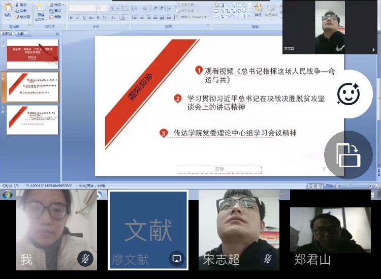 会议主要有以下几个议程:一、观看视频《总书记指挥这场人民战争—命运与共》。通过视频的学习,全体党员从“抗疫前线,中国担当”、“同舟共济,守望相助”、“命运与共,全球战疫”等三个层面更加深刻的认识到此次疫情中的中国精神、大国担当。第二个议程是学习贯彻习近平总书记在决战决胜脱贫攻坚座谈会上的讲话精神。习近平总书记在讲话上指出,此次脱贫攻坚座谈会的主要任务是分析当前形势,克服新冠肺炎疫情影响,凝心聚力打赢脱贫攻坚战,确保如期完成脱贫攻坚目标任务,确保全面建成小康社会。第三个议程是传达学习学院党委理论中心组关于十九届中纪委四次全会及省纪委十四届五次全会精神内容。