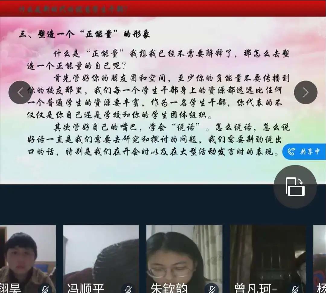 最后学姐以习近平总书记给北京援鄂医疗队“90”后党员的回信开头,告诉了我们什么是新时代的优秀学生干部。学姐对其做了四点的解释:第一,新时代的学生干部应该拥有一定的政治素养和理论水平,因为作为学生干部,我们需要明白自己的应该传达怎么的精神。第二,要不断增加自己的创新意识,例如活动创新,管理模式创新,思想创新等等。