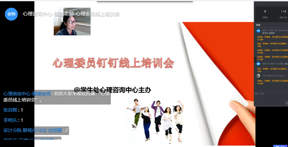 为更好地普及防疫心理健康知识,及时了解全院学生的心理状况,发挥心理委员群体工作力量,增强广大学生群体的心理自助能力,做到学生心理的全方位管控,心理咨询中心于3月29日晚19:00在钉钉上召开心理委员线上视频培训会,会议由116位心理委员参加,心理咨询中心邵蕾蕾老师主持会议。