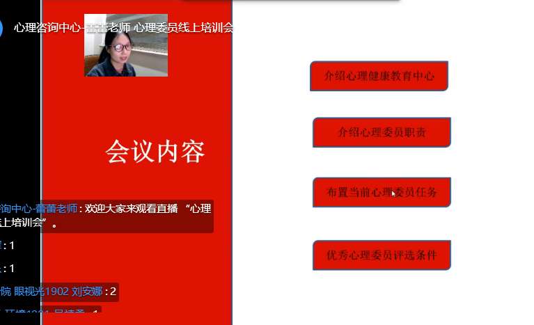 通过本次线上培训会,心理委员明确了自身的工作职责和任务,提高了心理委员对心理问题的识别能力,为学院更好地开展学生心理健康工作奠定了基础。