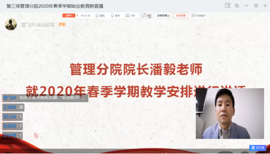 2020年4月8日晚上,管理分院通过钉钉直播方式分3场召开2020春季学期集中始业教育大会,管理分院党总支书记项光春老师、院长潘毅老师、各专业主任、2018级和2019级全体班主任及1483名2018和2019级学生等参加。大会由辅导员主持。