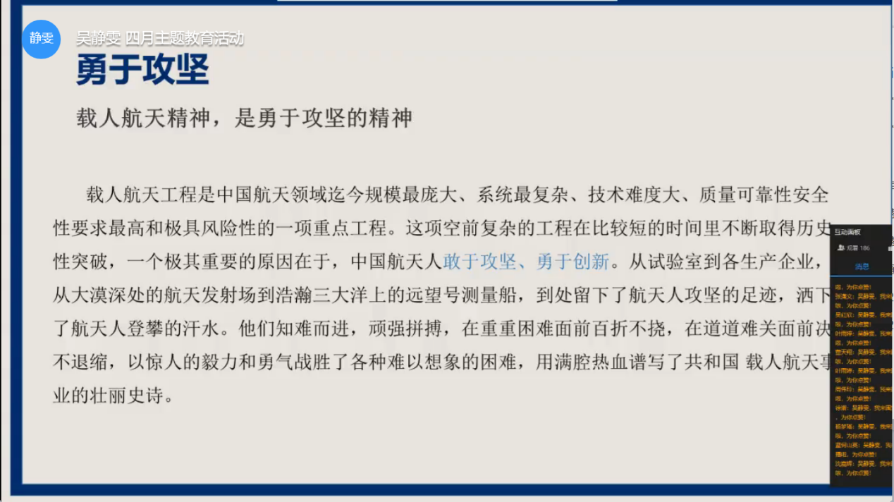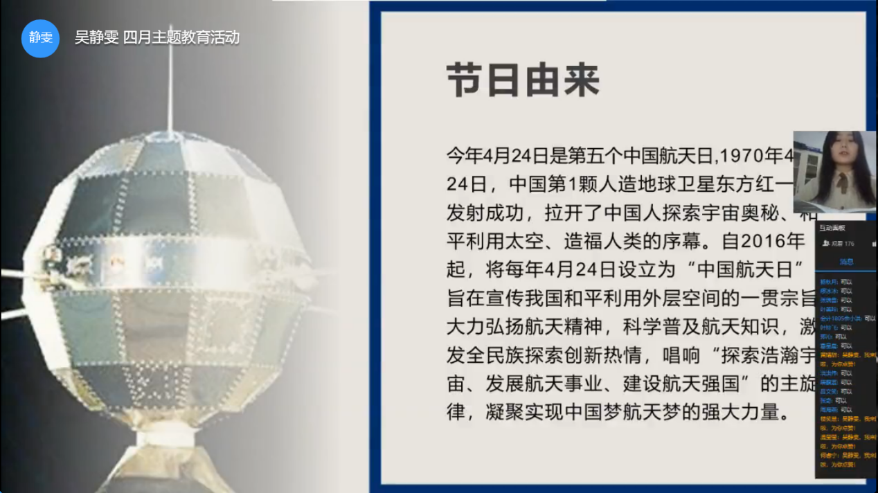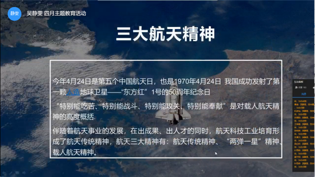 在第五个中国航天日来临之际,2020年4月19日晚,管理分院学生党支部在钉钉平台开展“航天精神”线上主题教育活动。本次活动由吴静雯同学主讲,参加此次主题教育的有管理分院学生党支部书记陈君老师以及18级、19级入党积极分子。