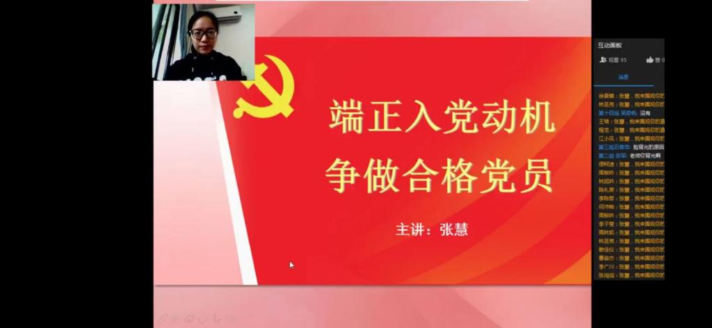 其中张老师提到正确的入党动机是经受组织考验的基石,是争当合格党员的起点。通过举例共产党员的英雄事迹和两个战疫视频来讲述一名合格的党员应该有的责任,并呼吁入党积极分子们应树立正确的价值观,提高党性修养。在这节课的最后,张老师提出“组织上入党一生一次!思想上入党一生一世”的重要观点另人印象颇深。