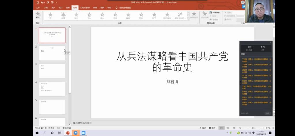 第二节课由学生社团第二支部书记郑君山老师带来《兵法谋略看中国共产党革命史》的授课。郑老师结合疫情来讲述中国共产党能够取胜的原因是坚持中国共产党全心全意为人民服务的宗旨,接着老师通过得“道”、得将、得领袖人物、军队纪律、情报优势等方面形象讲解了中国共产党革命的成功,中国共产党所具有的优越性,使得同学们更加坚定了早日入党的信念。