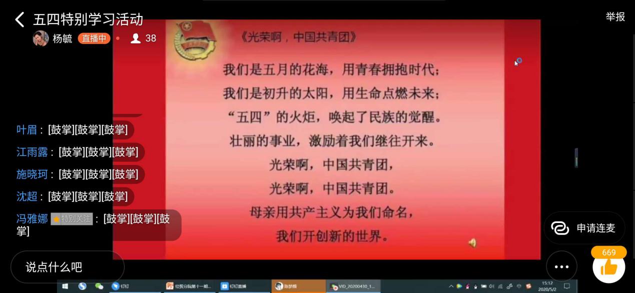 5月2日14:30,经济与贸易分院学习会以“五四精神传薪火,激扬青春献祖国”为主题的学习会“云”课堂暨第十一期集中学习如期在钉钉群里展开,经贸分院党总支书记张勰老师以及学习会35位成员参加了本次会议。