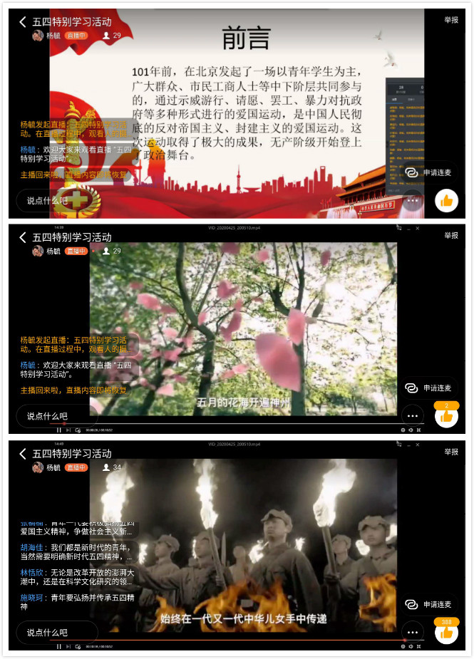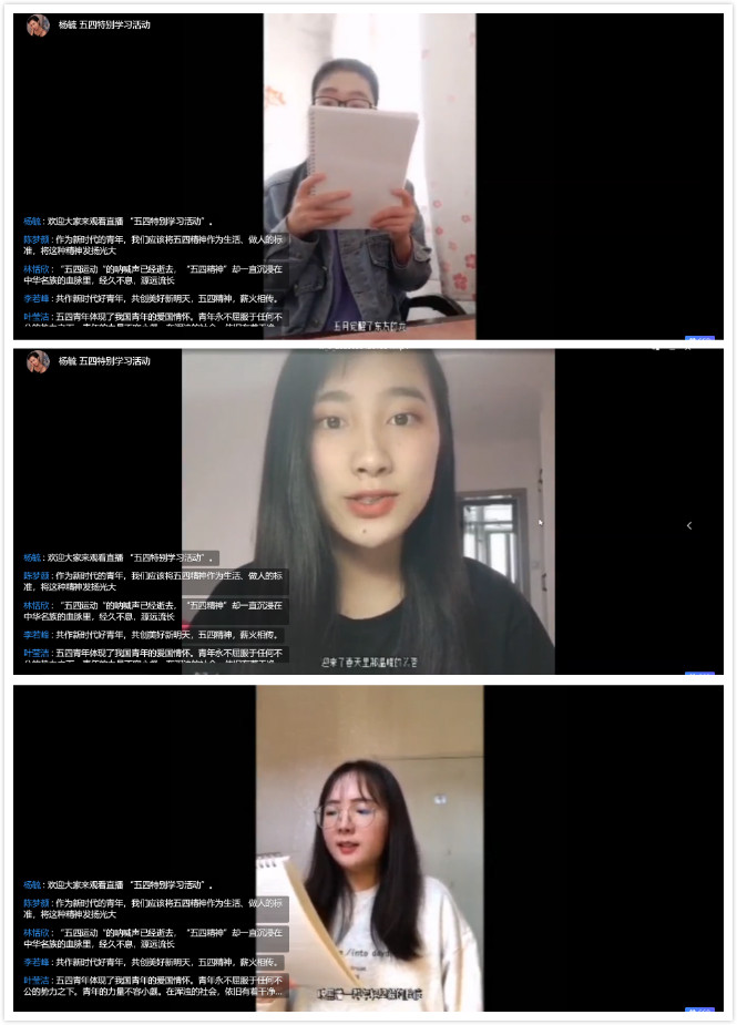 接下来,商英1901班魏静、商英1901班胡海佳、国贸1904方瑜婷三名学习会会员以短视频的形式朗读了纪念五四运动诗歌——《辉煌的五月》。主持人提到,习近平总书记给北京大学援鄂医疗队全体90后党员回信中写道:“在新冠肺炎疫情防控斗争中,青年人同在一线英勇奋战的广大疫情防控人员一道,不畏艰险、冲锋在前、舍生忘死,彰显了青春的蓬勃力量,交出了合格答卷。广大青年用行动证明,新时代的中国青年是好样的,是堪当大任的!”当代青年用自己的实际行动完美地诠释了“五四精神”。