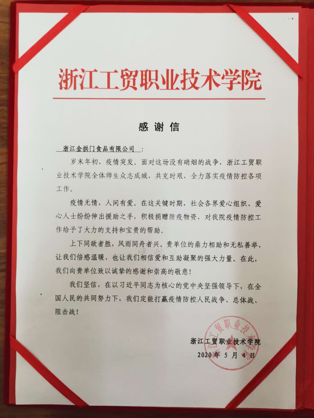 2020年4月30日,经济与贸易分院校企合作企业浙江金拱门食品有限公司主动向我院无偿捐赠232瓶免洗消毒凝胶,助力我院开展疫情防控工作,经济与贸易分院代表学院接受捐赠,并向企业发去感谢信。