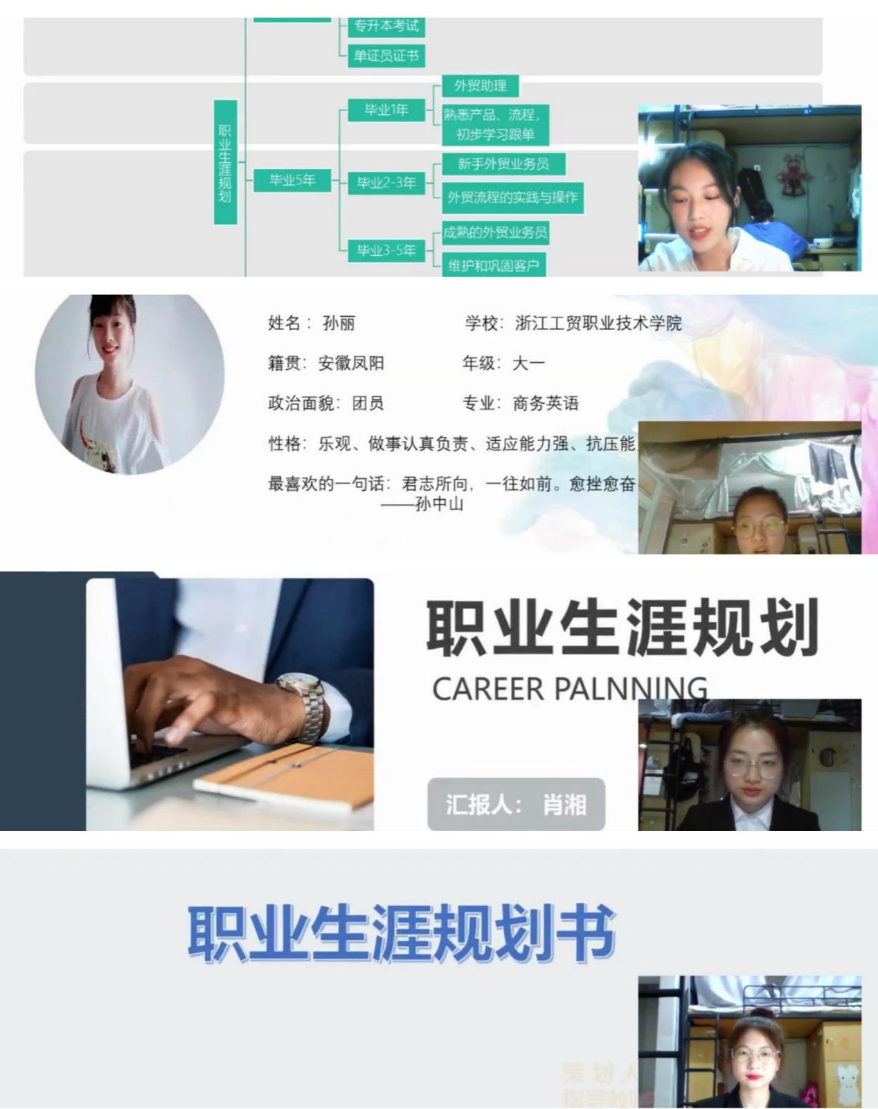 为深入贯彻落实全国教育大会精神,积极推进大学生职业规划教育和创新教育,引导大学生正确看待就业问题。5月26日晚18:00,经贸分院通过钉钉直播形式举办了以“规划职业蓝图,成就美好未来”为主题的职业生涯规划大赛。担任本次大赛的评委有创业学院教师郑君山,经贸分院党总支书记张勰,院长助理施星君,辅导员周妍妍、张娜。另外,线上还有近200名经贸学子共同观看了比赛。