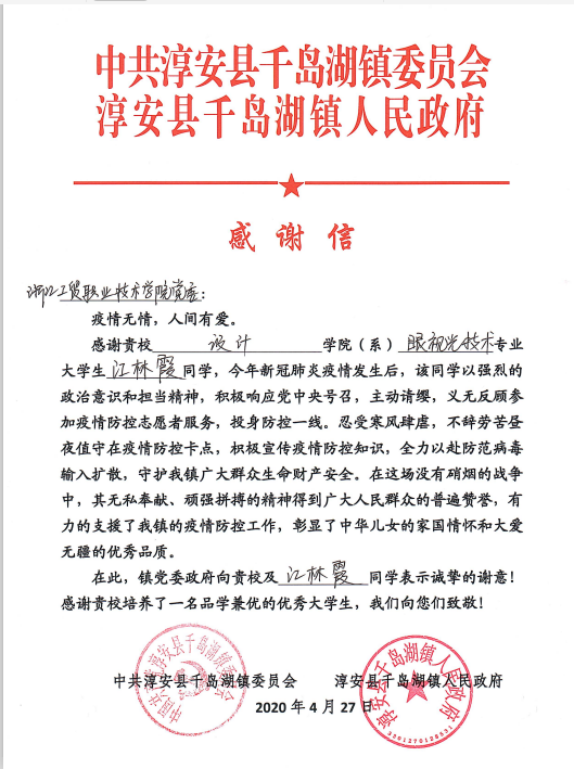 开学不久,设计分院收到来自淳安县千岛湖镇人民政府的感谢信,信中指出眼视光1905学生江林霞在疫情期间为该镇的防疫工作做出了巨大的贡献,她主动请缨,义无反顾参加疫情防控志愿者服务,投身防控一线。在这场没有硝烟的战争中,她无私奉献,有力的支援疫情防控工作,该镇党委政府特向我院表示谢意,感谢我院培养了一名品学兼优的优秀大学生。