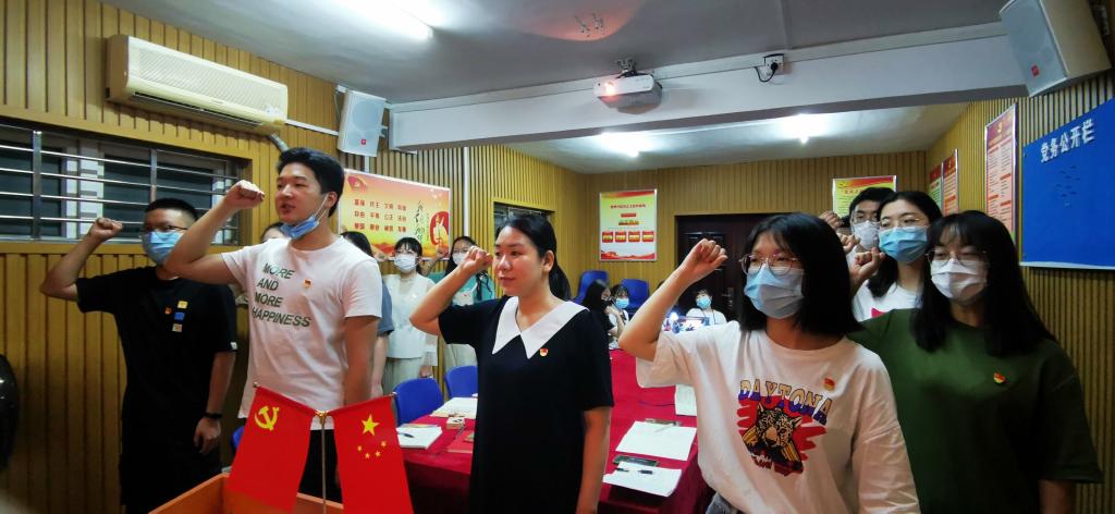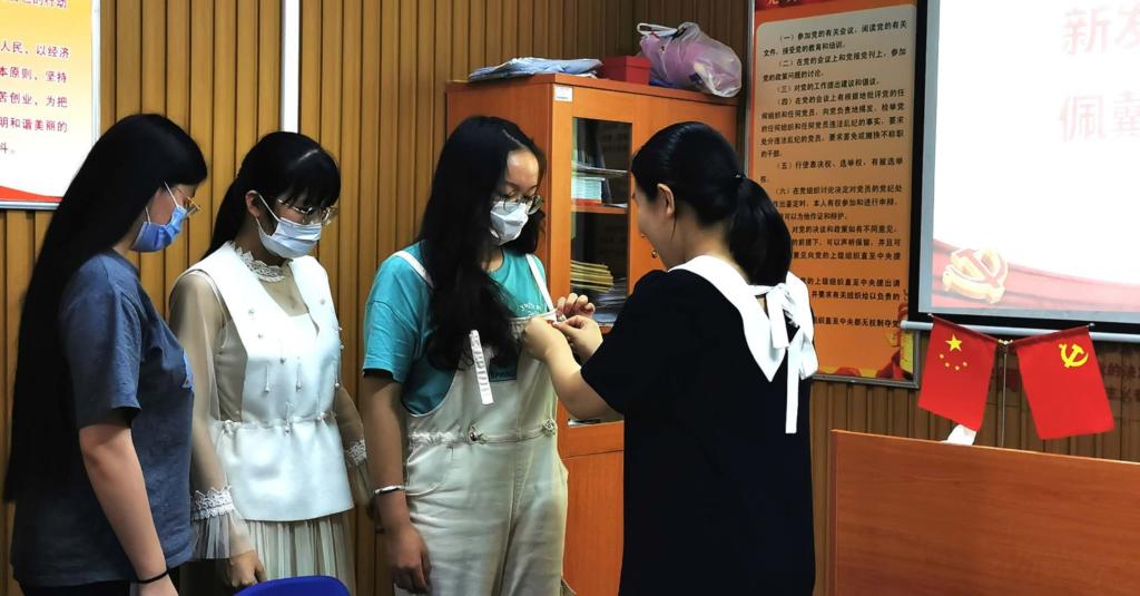 最后,陈君老师为新发展学生预备党员佩戴了党徽并带领全体党员进行入党宣誓。