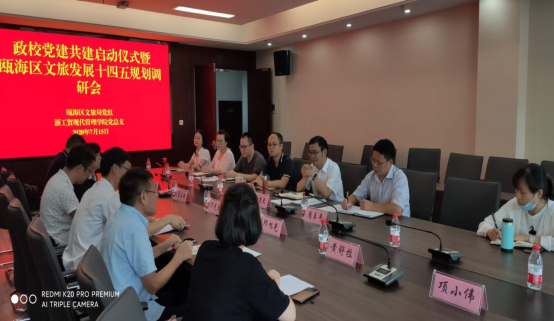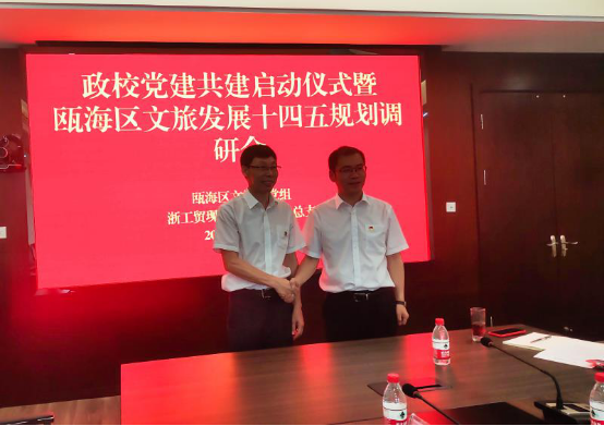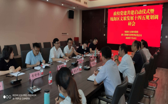 2020年7月15日上午,现代管理学院党总支与瓯海区文旅局党组校政党建共建启动仪式暨瓯海区文旅发展十四五规划调研会在瓯海区文化和广电旅游体育局会议室举行。瓯海区文旅局党组书记、局长沈显武,副局长潘王平以及文旅局有关部门负责人出席启动仪式。现代管理学院党总支书记项光春,现代管理学院旅游酒店专业党支部书记、旅游管理专业主任夏正超以及旅游管理专业全体老师参加。