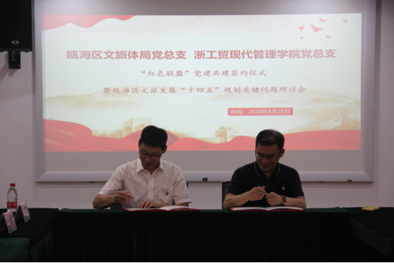 2020年8月25日,浙江工贸职业技术学院现代管理学院党总支和温州市瓯海区文化和广电旅游体育局党总支政校“红色联盟”合作共建签字仪式在浙江工贸职业技术学院温州风险投资研究院会议室举行,瓯海区文化和广电旅游体育局党组书记、局长沈显武,瓯海区文化和广电旅游体育局党总支书记、副局长李鹤,浙工贸现代管理学院党总支书记项光春,浙工贸现代管理学院副院长孙富山、叶珺君以及双方相关人员和相关专业老师参加仪式。瓯海区文化和广电旅游体育局党组书记、局长沈显武和浙工贸现代管理学院党总支书记项光春代表双方党组织在政校“红色联盟”合作共建协议上签字。