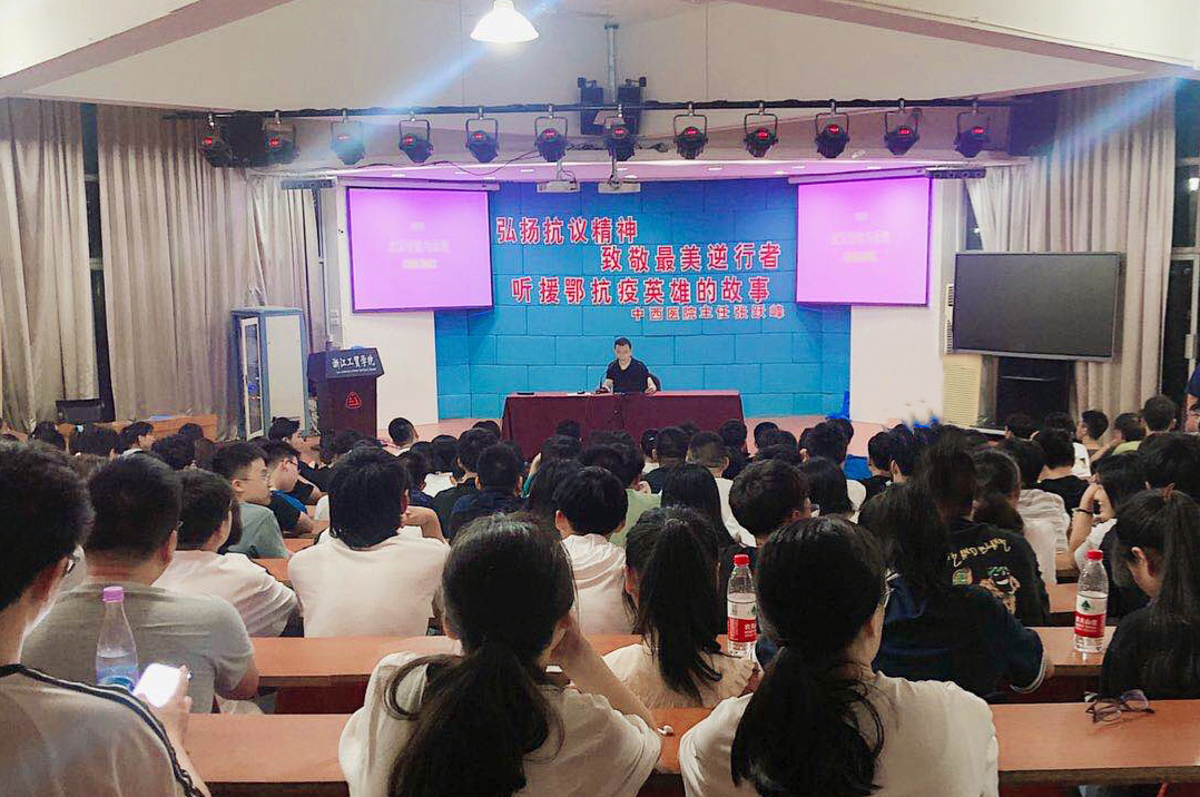 张跃峰作为温州支援武汉的首批医生,于除夕午夜收到上级的通知,正月初一早上就踏上赶往武汉的路。张主任给同学们分享了自己作为首批援鄂的医护工作人员的工作经历。因为疫情的突发性,导致了很多患者无法得到检测,也无法到医院进行救治,情况十分危机。初到武汉时被当时的场景所震惊,因为无护工和后勤,医护防护物资严重短缺,救助工作陷入了困境。