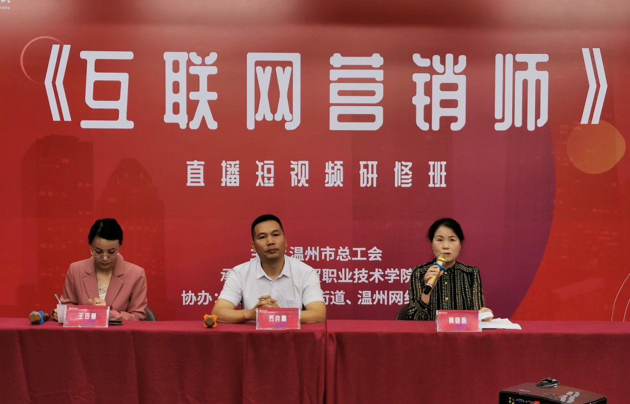 为加快新型数字化创新创业人才培养,提高我市产业工人队伍整体素质,助推职工创新创业和转岗再就业,9月19日上午,由温州市总工会主办,学院技师与继续教育学院承办的温州市职工网络主播培训班在蒲鞋市街道文创会客厅举行了开班仪式。温州市总工会权益保障部副部长方克鹏、技师与继续教育学院院长黄路瓯、温州市腾悦网络科技有限公司董事长王玲慧,以及来自我市20多家企业的50名学员参加了开班仪式。