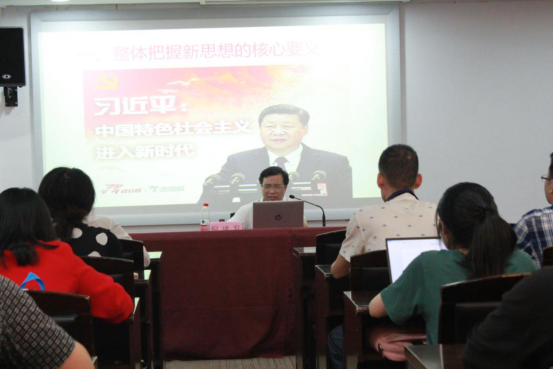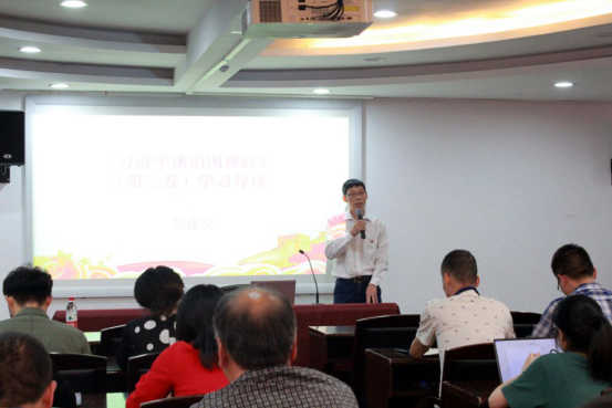 在党课授课中,倪建发副书记从“发展目标”“两个布局”“两个大局”“根本保证”“理论贡献”等方面全面阐述了习近平新时代中国特色社会主义思想的核心要义。从“历史方位”“本质特征”“思想主线”“两个布局”“阶段任务”“外交思想”等文本结构,全面梳理了习近平新时代中国特色社会主义思想的具体内容、《习近平谈治国理政》(第三卷)的19个专题。倪副书记通俗易懂的教学案例、幽默风趣的生动语言、深入浅出的理论分析,获得了在场师生党员阵阵的掌声。