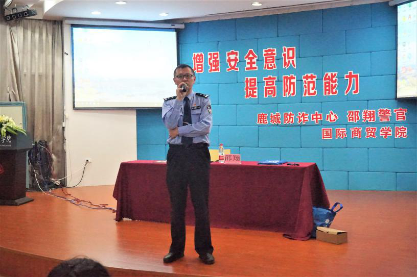 为营造平安和谐的校园氛围,国际商贸学院协同保卫处于10月28日晚18:00在阶梯教室举办了以“增强安全意识 提高防范能力”为主题的安全教育讲座,2020级全体新生参加。本次活动有幸邀请到鹿城区防诈骗中心邵翔警官担任主讲。
