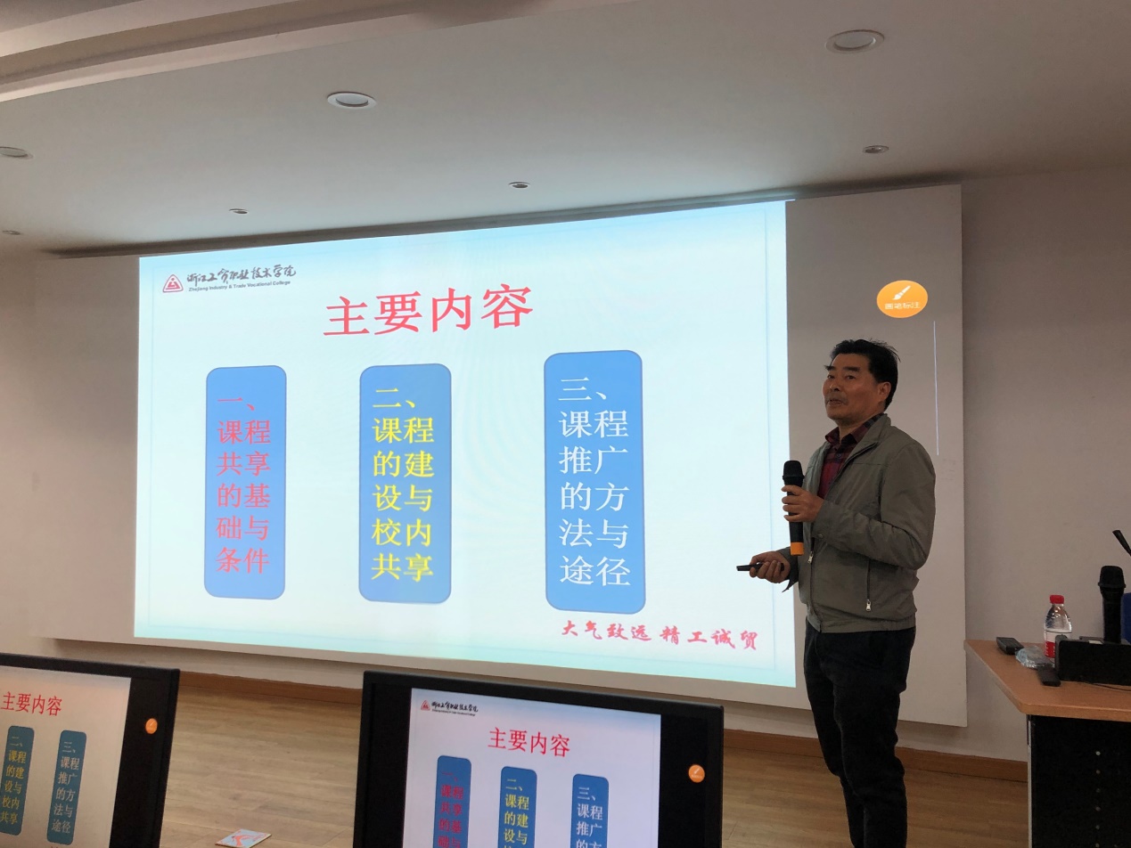施老师首先以详实的统计数据介绍了学院在线开放课程的建设现状、平台分布以及应用推广成效,指出了在“统筹布局谋划、课程开发设计、资源表现形式、推广路径开辟”等方面存在的不足,并就如何进一步推进在线开放课程建设提出了“4个系统、4个深入”的思路。