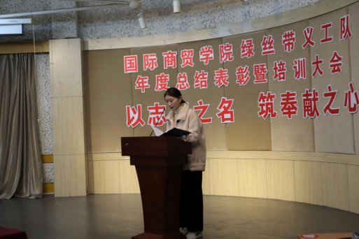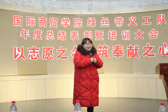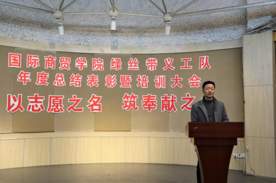 接下来王耀贵书记对此次表彰大会进行总结。书记代表分院对一直关心与指导我院志愿者活动的温州市和乐社会工作服务中心总干事吕丽瓦老师表示感谢;对参与志愿者活动并取得优秀成绩的先进集体、先进个人表示祝贺。王书记一方面对绿丝带义工队的工作给予高度肯定,另一方面希望志愿者们能在习近平新时代中国特色社会主义思想和奉献、友爱、互助、进步的志愿者精神的指引下,继续为国际商贸学院绿丝带义工服务队开创一个新的局面。