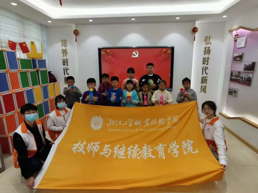 另一边的菱藕,随着讲师讲解空气火箭制作过程的结束,孩子们和志愿者齐心协力,用卡纸等材料制作出了空气火箭的样子,并在火箭上写下对于党的祝福。