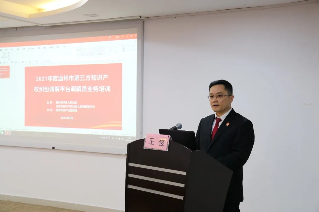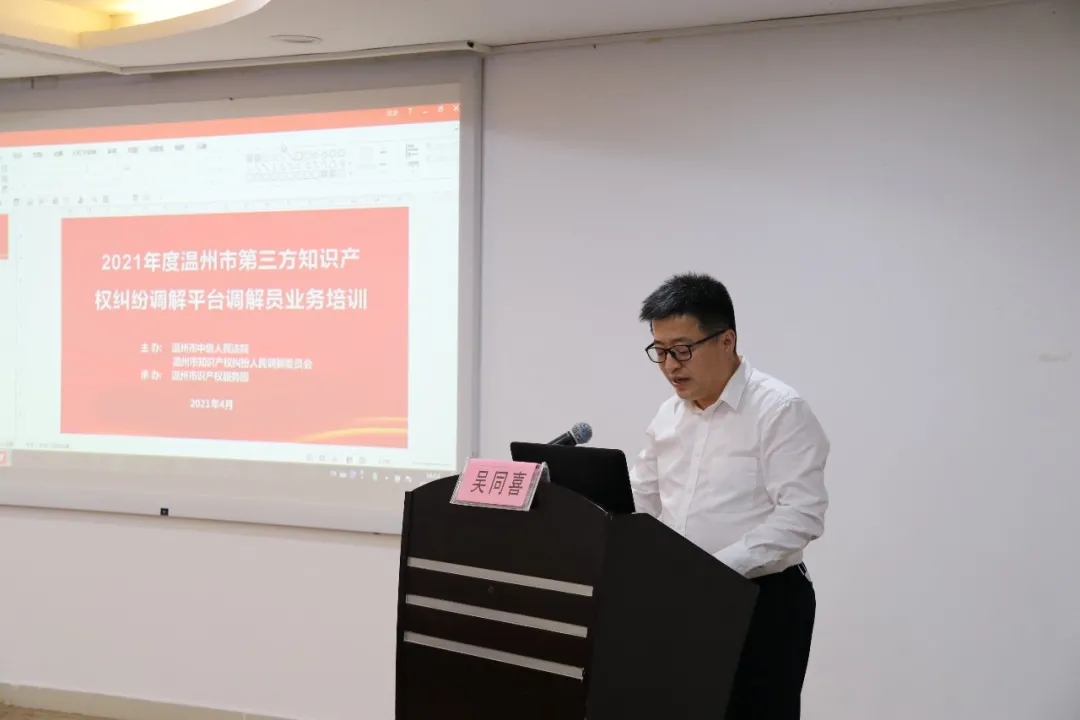 王俊庭长首先介绍了本次培训的背景和目的,面对知识产权纠纷急剧增加的现实需求以及数字化办案趋势,今年2月,温州市知识产权服务园作为第三方知识产权调解平台入驻全省ODR平台,这是我市目前唯一一家入驻ODR平台的知识产权类纠纷调解机构,为进一步发挥平台解决知识产权纠纷的‘分流阀’和‘稳定器’作用,经温州市知识产权保护联席会议研究和严格审核,2021年第三方知识产权调解平台续聘增聘了117位兼职调解员,新业务新形势对调解平台和调解员提出了更高的要求,举办本次培训有着迫切的现实需求和重要的意义。