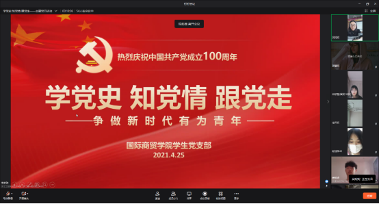 今年是中国共产党建党100周年,为全面加强党员党史教育,坚定理想信念,牢记初心使命,4月25日,国际商贸学院学生党支部以线上视频的形式开展“学党史 知党情 跟党走”为主题的四月份党日活动。会议由学生党支部书记吴妮妮主持,支部全体师生党员参加。