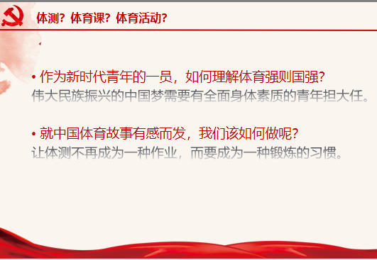 最后,朱老师呼吁每位同学能“强身健体,做时代新人”,她希望在今后的学习与生活中,同学们注重加强身体锻炼,她以习近平总书记说的“文明其精神,野蛮其体魄”来鼓励每一名入党积极分子和发展对象要起到带头作用,带领周围的同学们积极参与到体育运动中去,传承体育精神,奋进民族振兴,为党的建设和国家的发展强健体魄,铸就德智体美劳全面发展的综合素质。通过本次党课学习,同学们了解了体育的百年发展史和体育精神的内涵,更深刻地认识到体育的重要性,这些都将有助于鞭策同学们努力上进、奋发学习,这也将时刻提醒同学们在注重知识的积累与学习同时也要注重加强日常身体锻炼,勿忘国耻,为实现伟大中国梦做好充分身体储备而阔步向前!