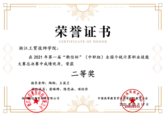 5月16日-17日,2021 年第一届“衡信杯”(中职组)个税计算职业技能大赛总决赛在线上隆重举行。技师与继续教育学院学生在专业教师的指导下,克服困难,拼搏进取,与来自全国各地的73所学校、近200支决赛队伍、700名参赛选手进行激烈角逐,在全国总决赛中取得全国二等奖、三等奖的优异成绩。