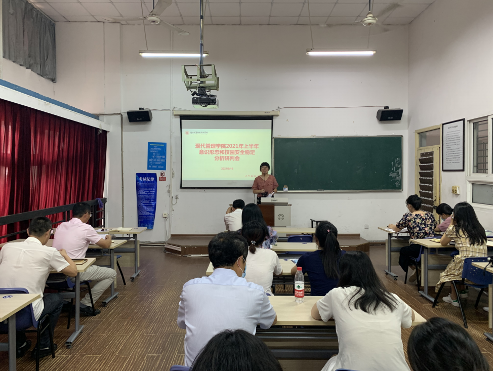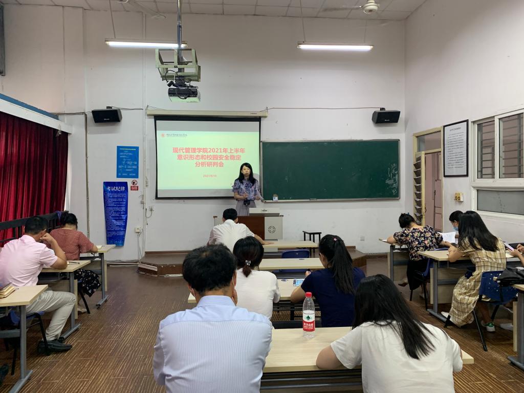 为了贯彻落实意识形态工作责任制,维护校园安全稳定,2021年6月16日,现代管理学院在府东路校区5208教室召开2021年上半年意识形态和校园安全稳定工作分析研判会,现代管理学院党政班子成员、全体行政人员和2019级、2020级全体班主任参加会议,会议由现代管理学院党总支副书记朱秀清老师主持。