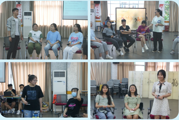 分院辅导员黄丹华老师作为主持人和嘉宾参与活动,与2020级的学生代表一起完成轻松愉快的“心灵之旅”。为了增进师生交流,营造轻松氛围,黄老师与同学们围着圆圈而坐。黄老师以游戏“海内存知己、天涯若比邻”认识到场的每位同学。十六位同学随机分成四组,每组4人,进行三分钟的相互认识和熟记组员信息。每位同学用心熟记组员,并在汇报环节认真介绍组内成员的基本情况。而后,继续以小组为单位进行“你画我猜”、“逛三园”、“叫七也逢七”等游戏环节。在轻松的游戏氛围中,各位同学们露出了灿烂的笑容,现场氛围热闹而又欢快。活动的最后,各位同学们在纸上匿名写下最近的烦心事和小疑惑,由辅导员黄老师随机抽取小纸条,帮助解答同学们的小心事。