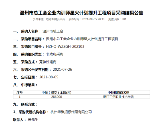 近日,浙江政府采购网公布了温州市总工会企业内训师星火计划提升工程项目采购结果公告,浙工贸人力资源工作坊人力资源专业教师团队凭着优秀的专业团队优势、多年的社会服务培训经验和高质量的培训方案得到专家的充分肯定,一举中标。