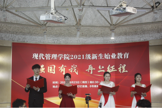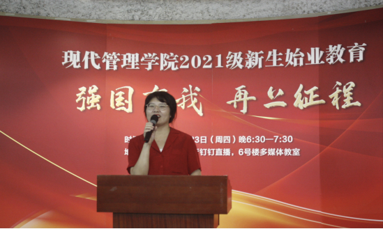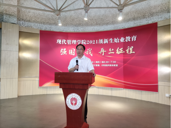 最后,现代管理学院党总支书记项光春老师做新生寄语。项老师说,2021年是中国共产党成立100周年,是全面建成小康社会,开启建设社会主义现代化国家新征程的开局之年,习近平总书记在庆祝中国共产党成立100周年大会上指出,“一百年前,一群新青年高举马克思主义思想火炬,在风雨如晦的中国苦苦探寻民族复兴的前途。一百年来,在中国共产党的旗帜下,一代代中国青年把青春奋斗融入党和人民事业,成为实现中华民族伟大复兴的先锋力量,习近平总书记勉励新时代的中国青年要以实现中华民族伟大复兴为己任,增强做中国人的志气、骨气、底气,不负时代,不负韶华,不负党和人民的殷切期望”。项老师希望全体同学通过增长知识、锤炼品格,以真才实学服务人民,以创新创造贡献国家,以实际行动践行“强国有我”的青春承诺。